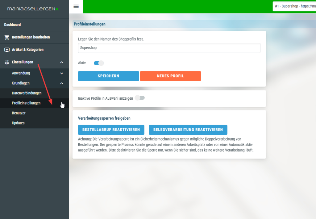 Sobald das Profil gespeichert wurde, können Sie es über das Auswahlmenü am oberen rechten Bildschirmrand (in Ihrem Screenshot als #1 - Supershop... sichtbar) auswählen.
